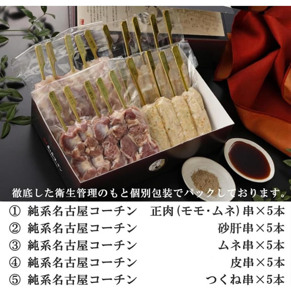 | 内容量 | 純系名古屋コーチン 正肉(モモ・ムネ)串 5本セット 純系名古屋コーチン 砂肝串 5本セット 純系名古屋コーチン ムネ串 5本セット 純系名古屋コーチン つくね串 5本セット 純系名古屋コーチン 皮串 5本セット |