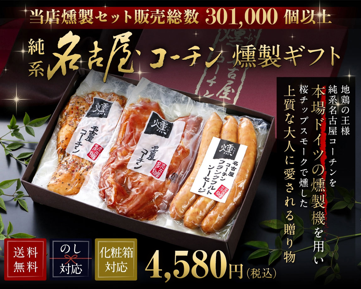 商品名 | 純系 名古屋コーチン 燻製3種セット(もも開き・むね肉燻製・フランクソーセージ) |